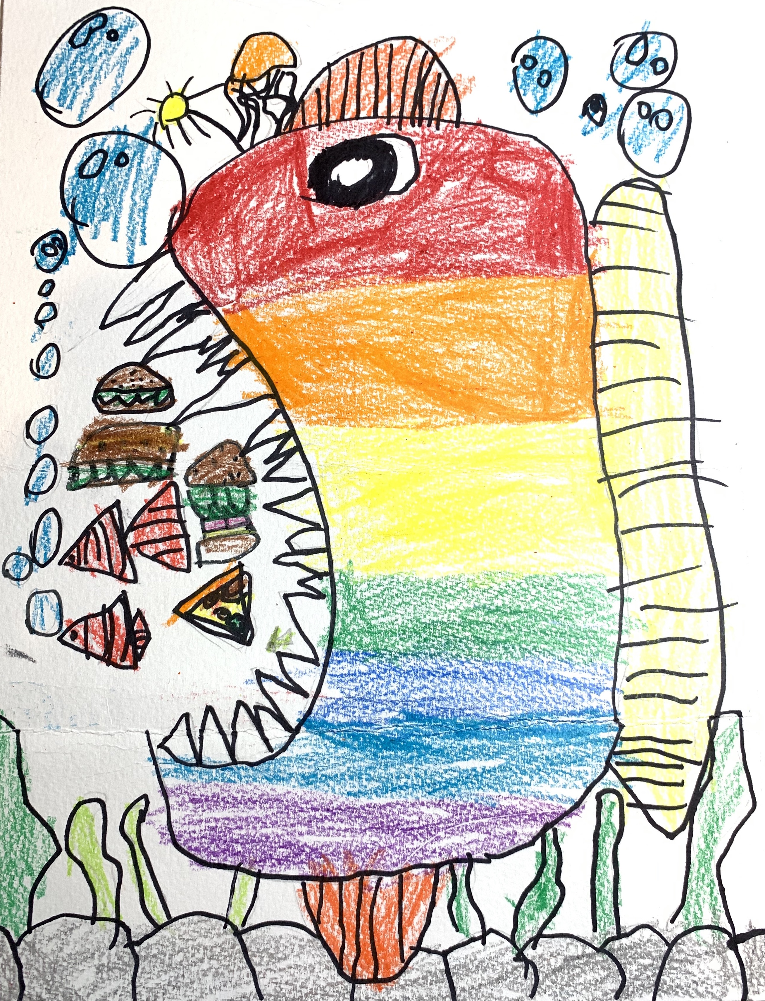 最后说说画啦啦, 试课感觉和CalColor有类似之处,老师会带小朋友先观察实物图片,绘画内容按照主题自由发挥,老师会帮小朋友依次单独辅导。试课之后老师也发来课程安排,按照年龄和学习年限循序渐进。他家的app做的也不错,每次课前有预习小视频,提醒准备画具,课后完成提交作品后老师会点评并提供范例图片。每周一个主题,鼓励小朋友观察生活中的事物进行描绘,并且反复练习基础的装饰涂色方法,课上没能画完的莫莫下课也会自己继续完成,有时候还越画越开心。要非让我再说一个优点,那就是小农妈最爱的价格,是这三个中最便宜的。我们已经上了十几次课,觉得物有所值。贴几张我觉得挺有意思的画,献丑。